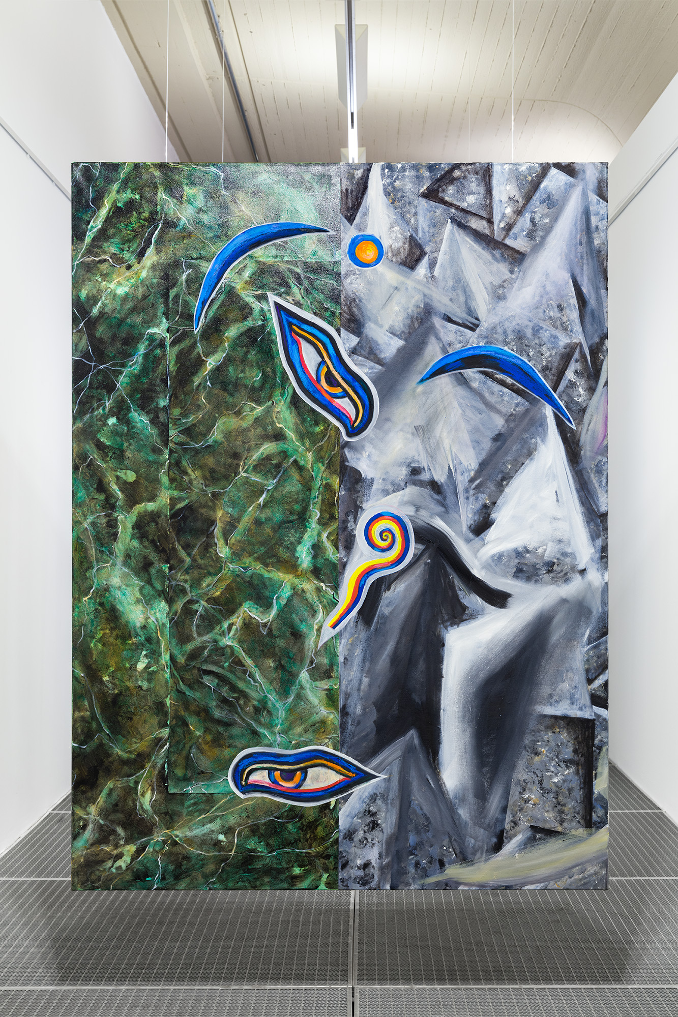 In painting, layered surfaces emerge in which gesture, imitation, and symbolic trace converge. Hybrid spaces such as caves, raves,